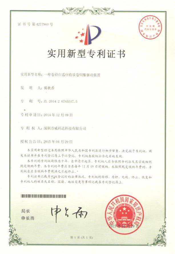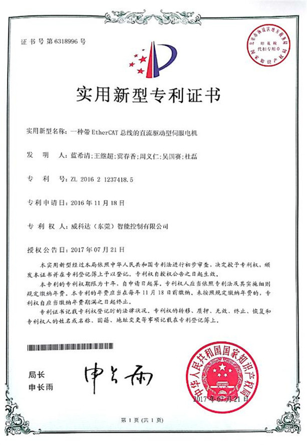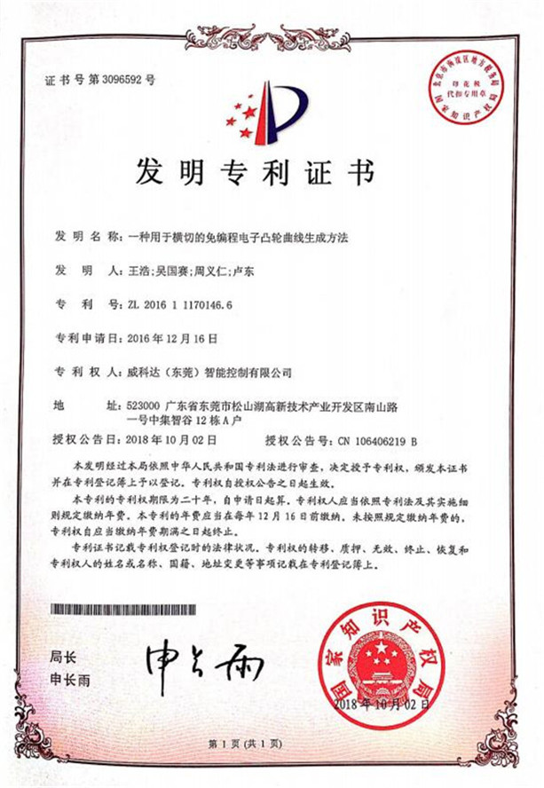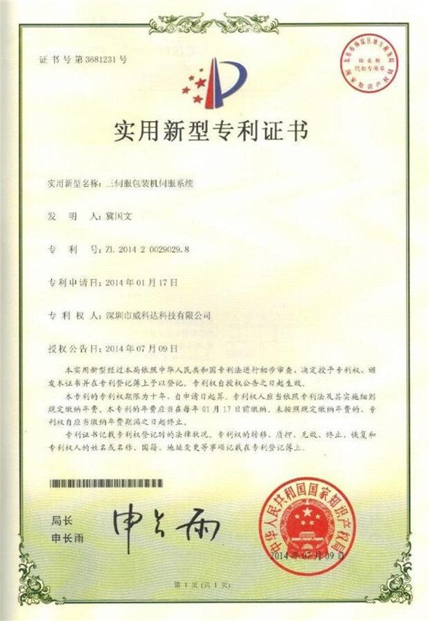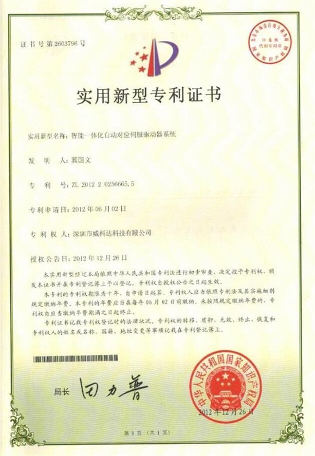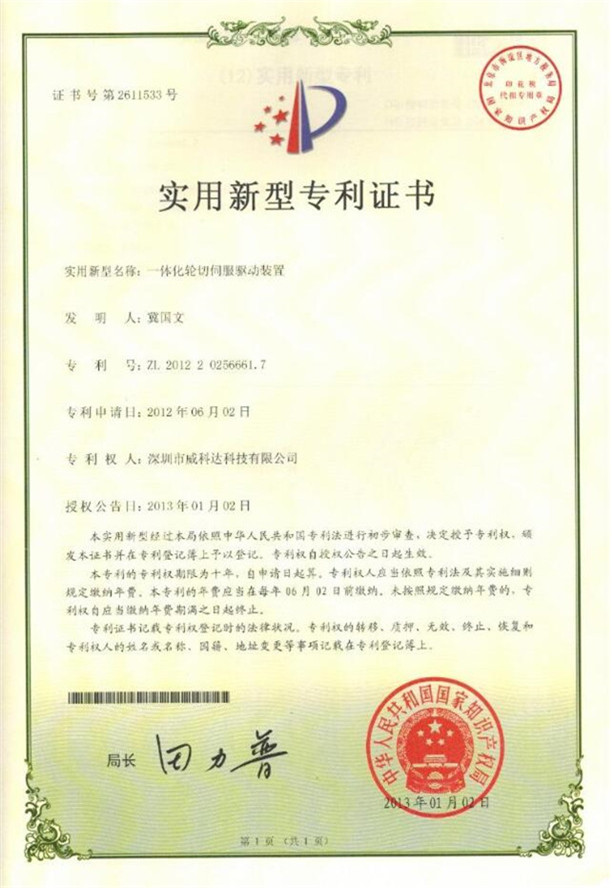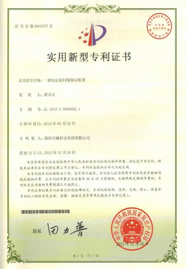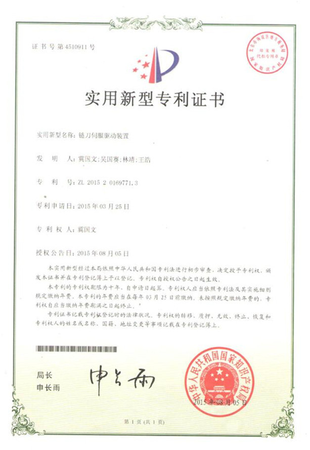 鏈刀伺服驅動(dòng)裝置專(zhuān)利證書(shū)